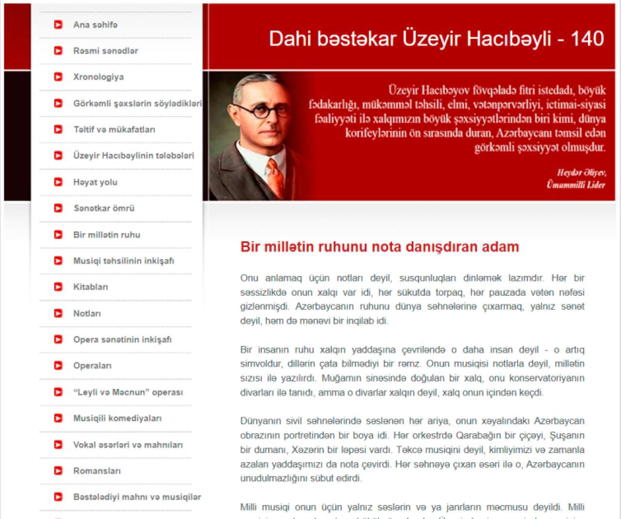 Həmçinin dahi bəstəkarın layiq görüldüyü orden, mükafat və fəxri adlarla yanaşı, müəllifi olduğu operaların, musiqili komediyaların, romansların, vokal əsərlərin və mahnıların siyahısı təqdim edilib. Bazada “Üzeyir Hacıbəylinin Azərbaycanda musiqi təhsilinin inkişafında rolu”, “Bir millətin ruhunu nota danışdıran adam”, “Sənətkar ömrü” kimi məqalələrin tam mətni ilə yanaşı, müəllifi olduğu, redaktə etdiyi, “Ön söz” yazdığı və onun haqqında qələmə alınan Azərbaycan, türk, ingilis, fransız və rus dillərində nəşr edilən kitab və məqalələrin siyahısı da nümayiş olunub.