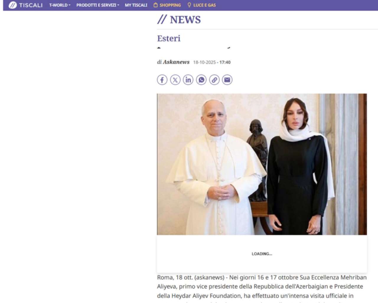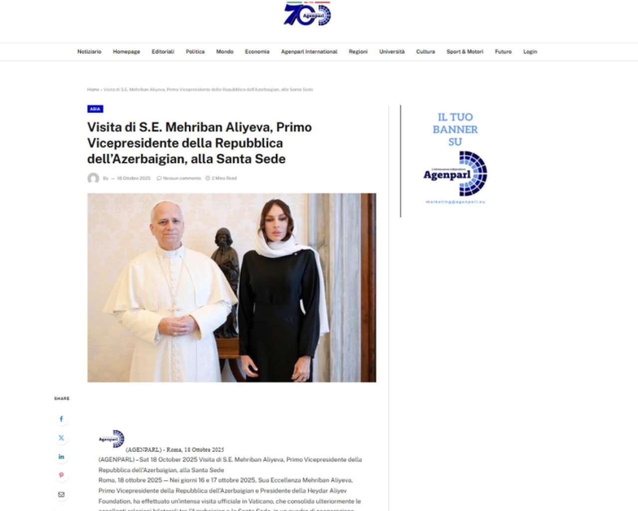 Azərbaycanın Birinci vitse-prezidenti Mehriban Əliyevanın Vatikana rəsmi səfəri çərçivəsində oktyabrın 17-də Roma Papası XIV Leo ilə görüşdüyü bildirilir. Qeyd olunur ki, görüşdə Müqəddəs Taxt-Tacın Azərbaycandakı Katolik Kilsəsinin fəaliyyəti, eyni zamanda, ikinci Katolik Kilsəsinin tikintisi ilə əlaqədar aparılan hazırlıq işləri barədə məlumat verilib.