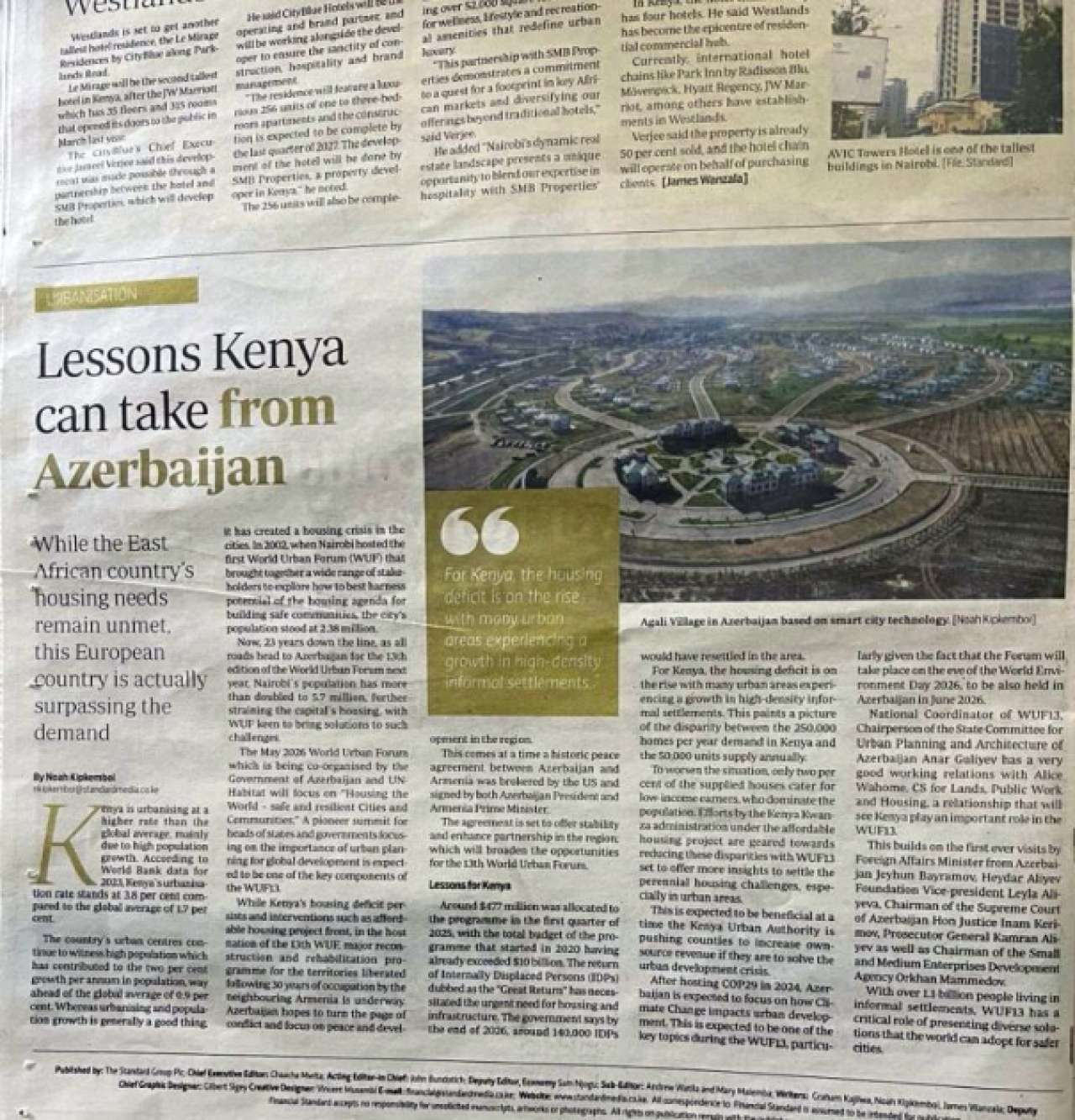 "Şərq qapısı" xəbər verir ki, məqalədə ölkəmizin gələn il mayın 17-dən 22-dək ev sahibliyi edəcəyi Ümumdünya Şəhərsalma Forumunun 13-cü sessiyasında (WUF13) əsas müzakirə mövzularından birinin əlçatan mənzillərin inşası olduğu, bu məsələnin isə Keniya üçün xüsusi əhəmiyyət daşıdığı vurğulanıb. Vaşinqtonda Azərbaycan, ABŞ və Ermənistan liderlərinin imzaladıqları Birgə Bəyannamənin WUF 13-ün əhatə dairəsi və təsir imkanlarının genişlənməsi üçün ciddi imkanlar yaradacağı bildirilib.