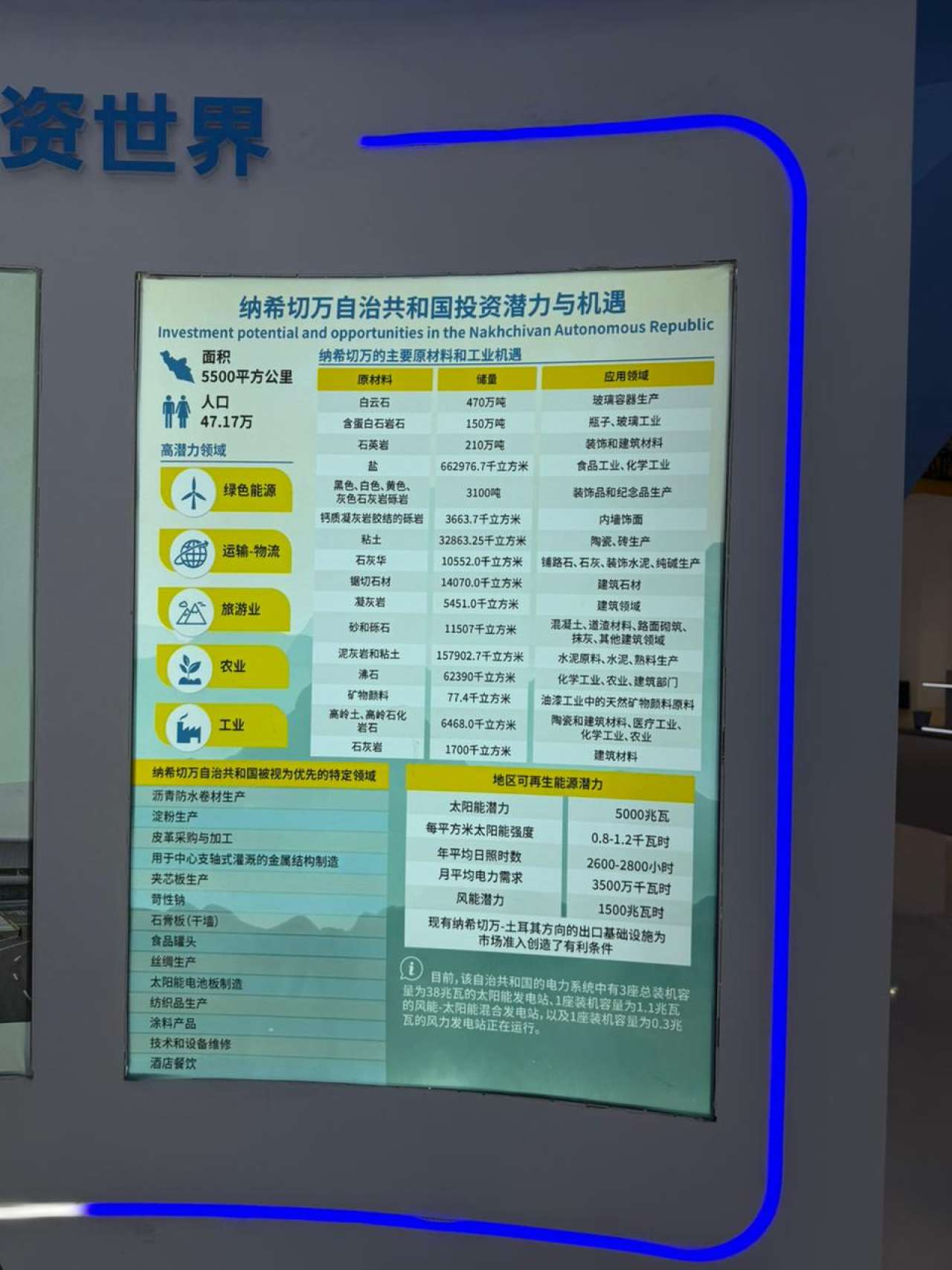 Muxtar respublikanın ilk dəfə təmsil olunduğu sərgidəki stenddə Naxçıvanda yerli xammal hesabına yaradılması səmərəli hesab olunan sahələr, eləcə də “yaşıl enerji”, turizm, nəqliyyat-logistika, sənaye və kənd təsərrüfatı imkanları barədə məlumatlar təqdim olunur.