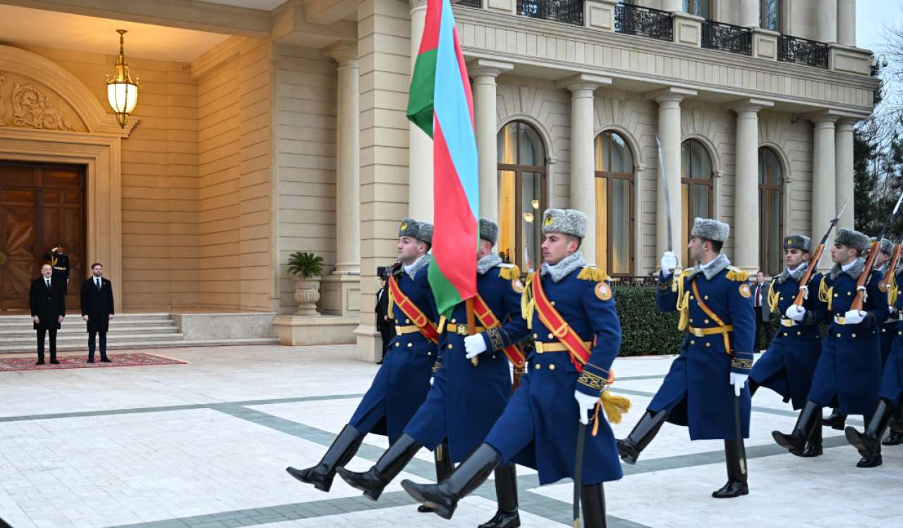 The guard of honor marched past President Ilham Aliyev and Vice President JD Vance to the accompaniment of a military march.