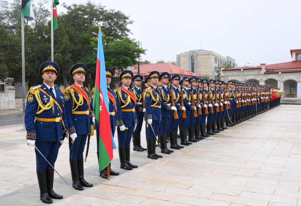 The guard of honor marched in front of President Ilham Aliyev and President Sheikh Mohamed bin Zayed Al Nahyan to the accompaniment of a military march.