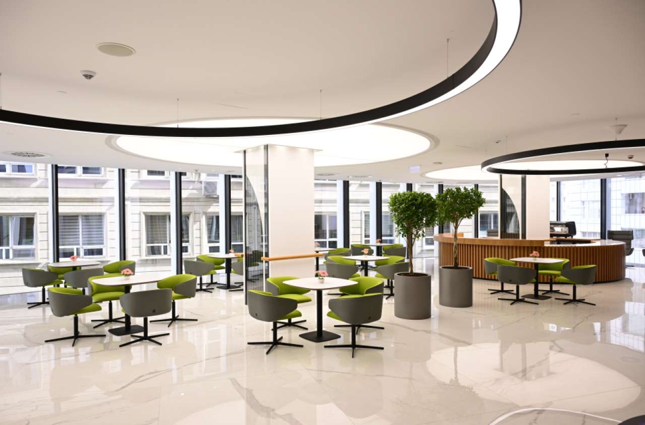 A suspended green terrace spanning 1,200 square meters has been created on the fifth floor of the building, featuring a variety of trees and ornamental shrubs. A 500-square-meter open-air area has been developed to include a recreational and walking zone for employees, along with a newly built café.