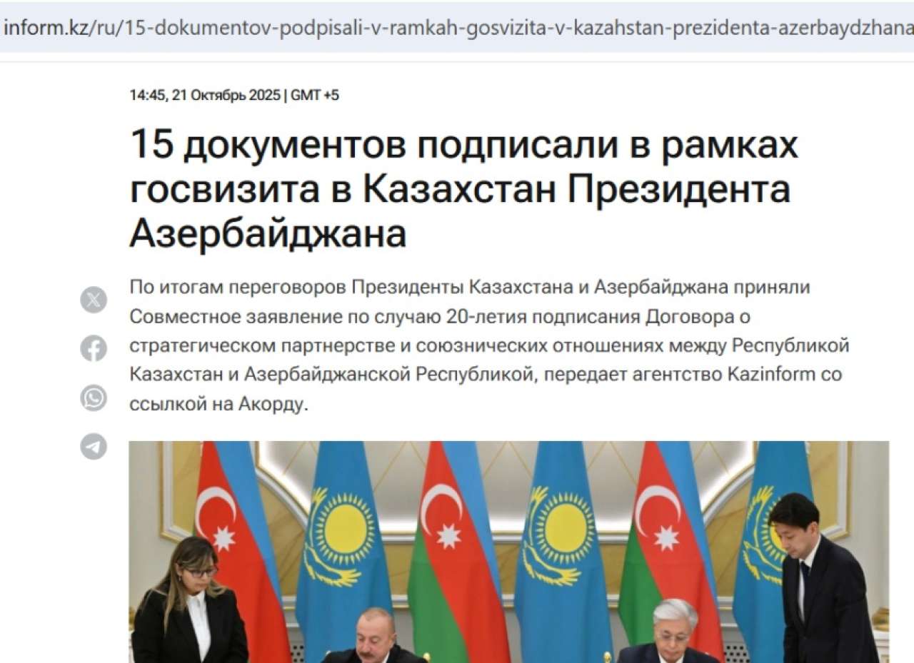 News portals reported that 15 documents on cooperation in energy, transport and logistics, digitalization and artificial intelligence, industrial safety, healthcare, statistics, as well as cultural and humanitarian fields, were signed during President Ilham Aliyev’s state visit to Kazakhstan.