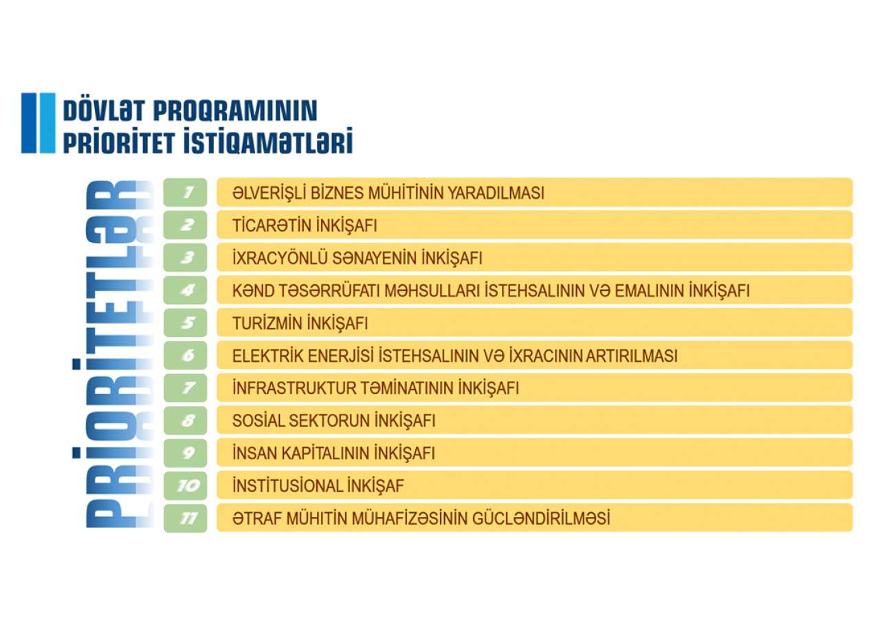 Bu məqsədə nail olmaq üçün 2023-2027-ci illər üzrə 11 prioritet istiqamət müəyyən olunmuş, Dövlət Proqramının həyata keçirilməsi ilə bağlı icrası planlaşdırılan bütün tədbirlər həmin prioritet istiqamətlər üzrə qruplaşdırılmışdır.