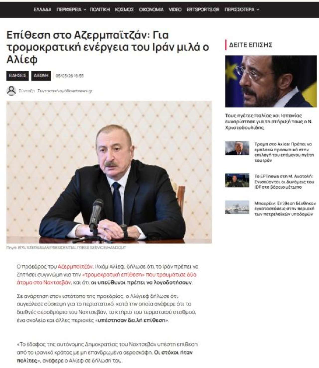 Yunanıstanın dövlət televiziya və xəbər platforması "ERT News" yazır ki, Prezident İlham Əliyev Azərbaycanın ərazisinə edilən dron hücumunu İran tərəfindən həyata keçirilmiş terror aktı kimi qiymətləndirib.