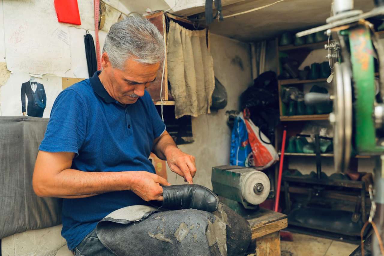 Qapıdan içəri girirəm. Qoxu məni ilk dəqiqədən qarşıladı – nə təravətli qoxudur, nə də gül ətridir. Bu, dəri ilə yapışqanın qarışığından doğan bir qoxudur. Bir qədər əvvəl dediyim kimi küncdə toz basmış köhnə tikiş maşını dayanır. Divardakı rəflərdə minlərlə mismar, ip, dəri parçası. Amma hər şeyin öz yeri var. Bu nizam sanki ustanın daxili aləminin xəritəsidir. Qapının ağzında yarımçıq qalmış bir cüt qara ayaqqabı. Çəkic səsi havada ritm tutur – taq… taq… taq...