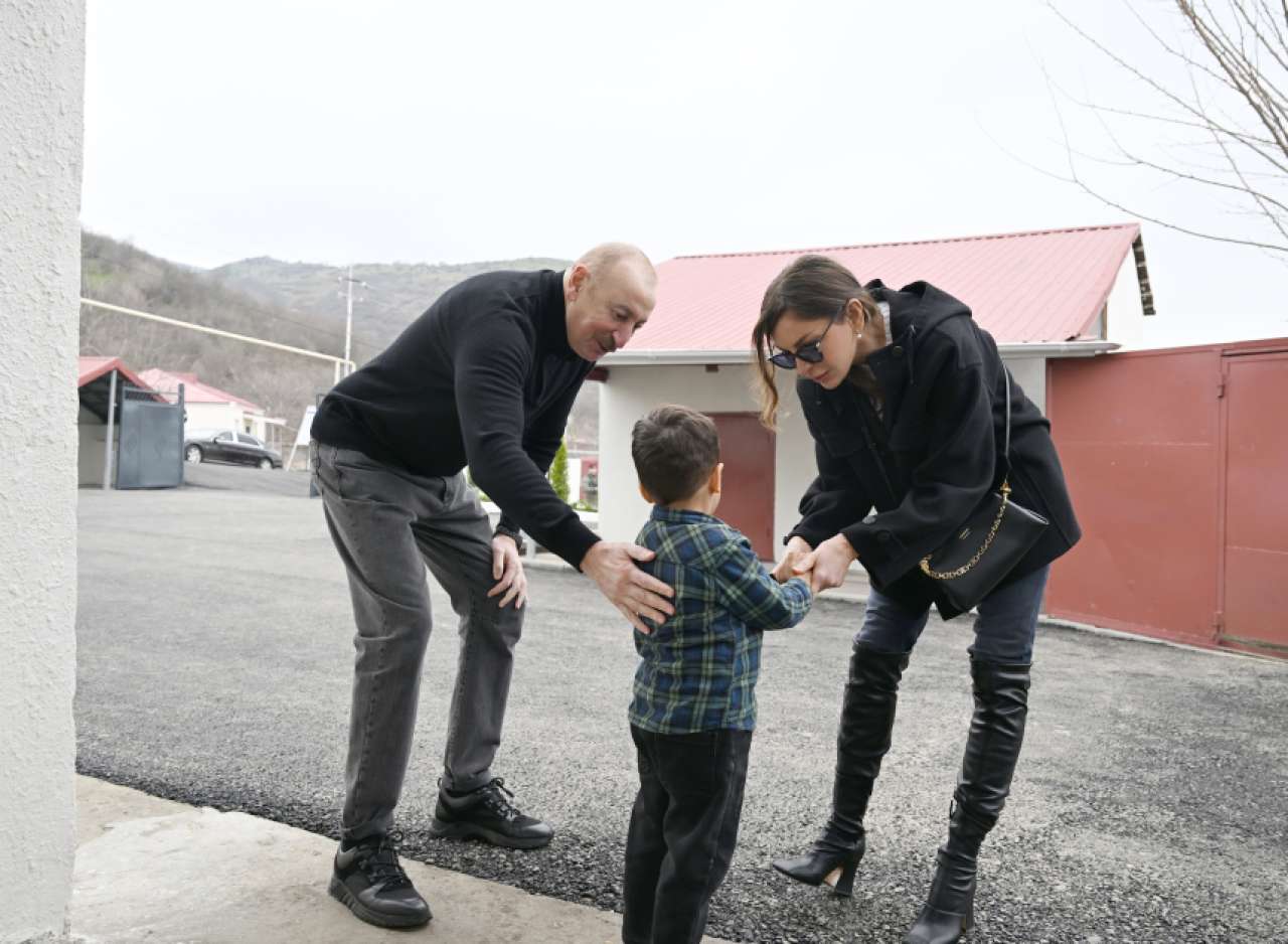 The head of state and the First Lady also visited the home of Beybala Gasimov, a resident who recently returned to the village.