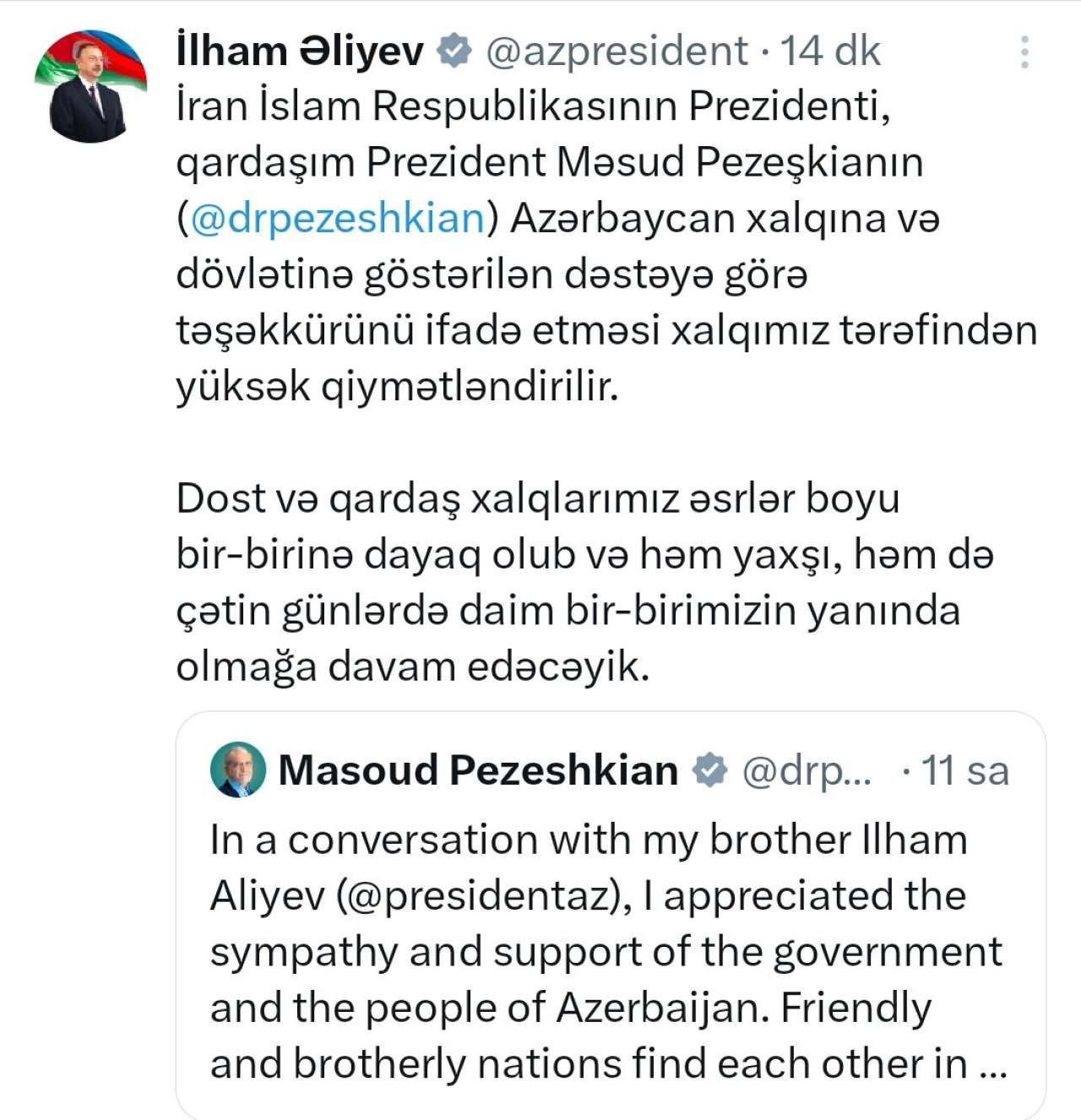 Paylaşımda deyilir: “İran İslam Respublikasının Prezidenti, qardaşım Prezident Məsud Pezeşkianın (@drpezeshkian) Azərbaycan xalqına və dövlətinə göstərilən dəstəyə görə təşəkkürünü ifadə etməsi xalqımız tərəfindən yüksək qiymətləndirilir.