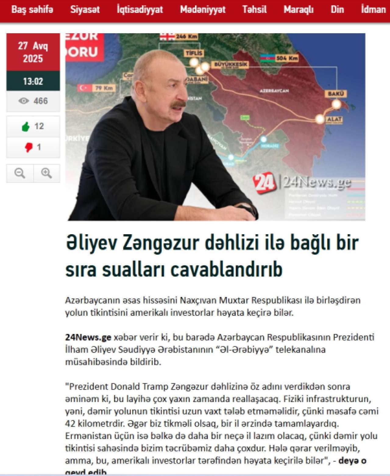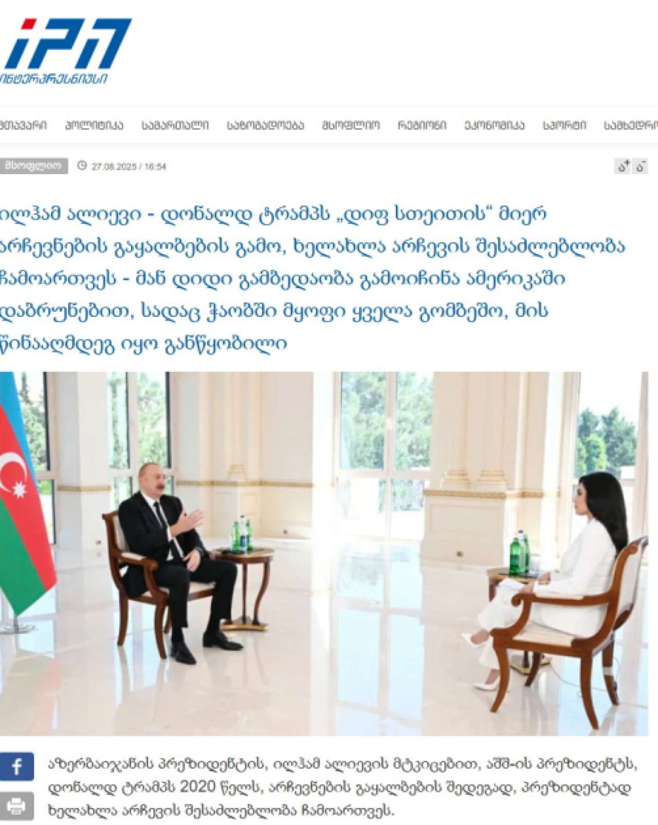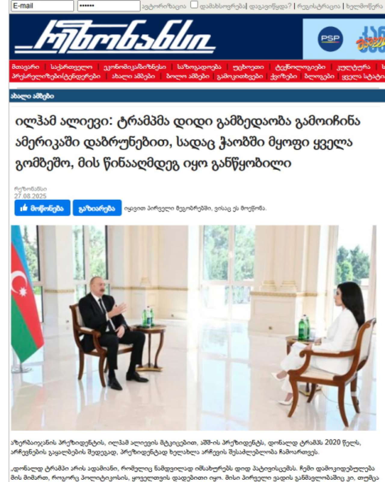 “Şərq qapısı” xəbər verir ki, Gürcüstanın nüfuzlu “interpressnews.ge”, “palitranews.ge”, “aktual.ge”, “resonancedaily. com”, “24news.ge” informasiya portalları və “1tv.ge” televiziya kanalı Azərbaycan Prezidentinin müsahibəsindən materiallar hazırlayıb.