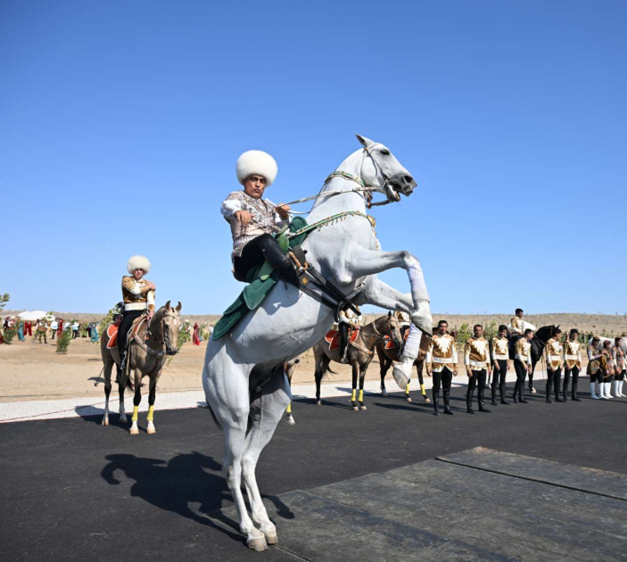 Avqustun 22-də Azərbaycan Respublikasının Prezidenti İlham Əliyev, Türkmənistan Xalq Məsləhətinin sədri Qurbanqulu Berdiməhəmmədov və Özbəkistan Respublikasının Prezidenti Şavkat Mirziyoyev Türkmənbaşı şəhərində “Axaltəkə” atlarına və milli “Galkynysh” atlı qrupunun çıxışına baxıblar.