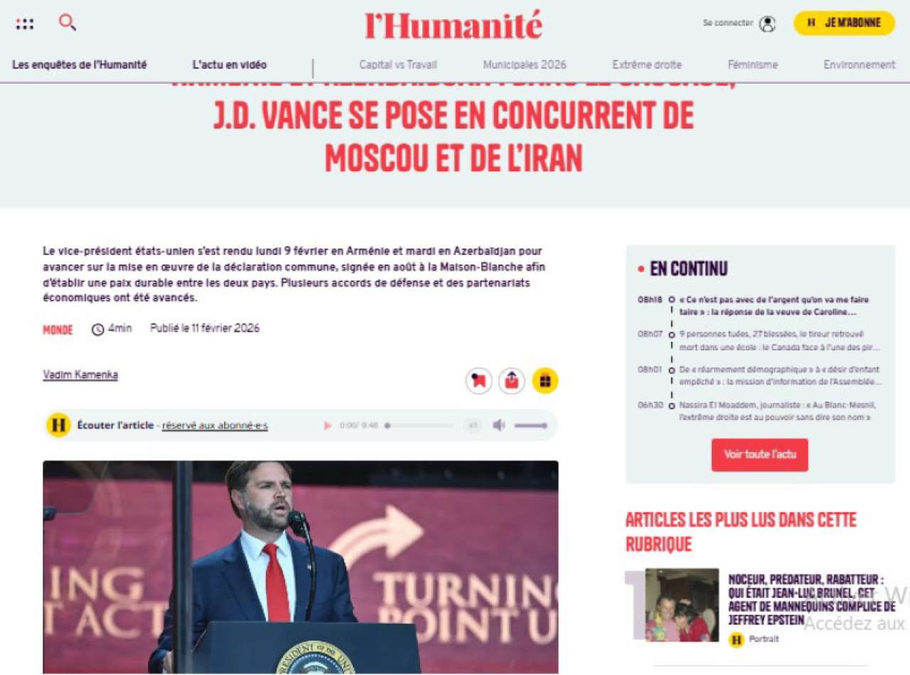 Fransanın informasiya portalları, televiziya və radioları Amerika Birləşmiş Ştatlarının Vitse-prezidenti Cey. Di. Vensın Bakıya səfərini, Prezident İlham Əliyevlə görüşünü işıqlandırıblar.