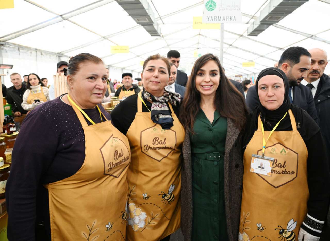 During the visit, Leyla Aliyeva and Arzu Aliyeva viewed the stands, familiarized themselves with various types of honey and beekeeping products presented by the beekeepers, and were briefed on the production process and quality indicators of the products. They had a conversation with the beekeepers about seasonal productivity and sales opportunities, and posed for photos.