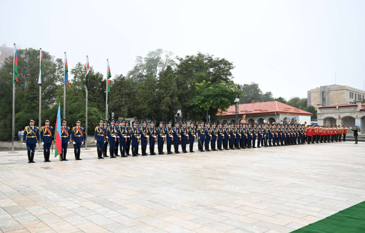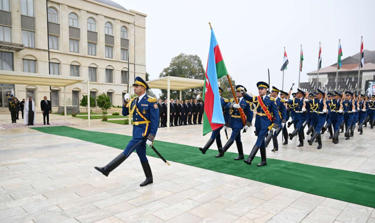 The guard of honor marched in front of President Ilham Aliyev and President Sheikh Mohamed bin Zayed Al Nahyan to the accompaniment of a military march.