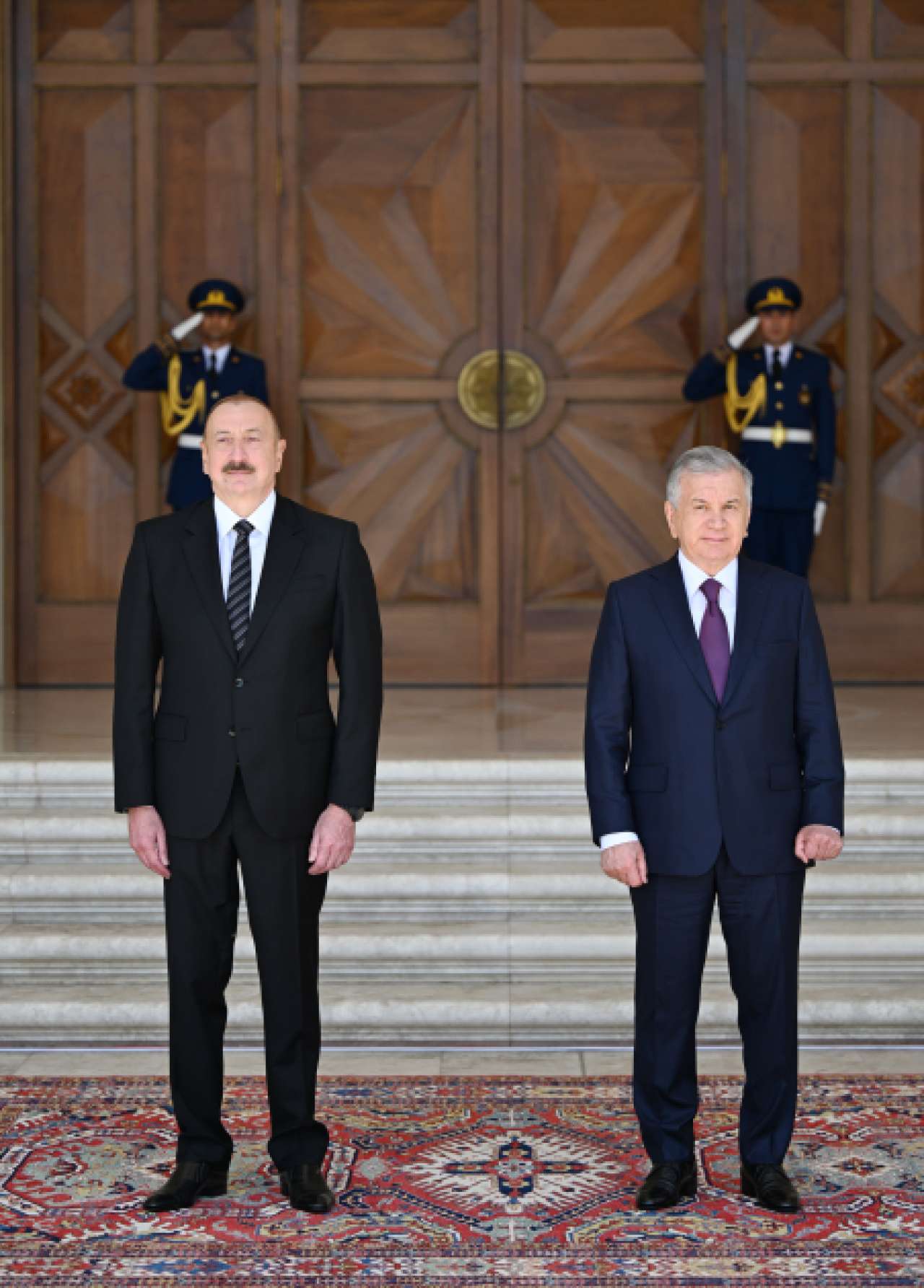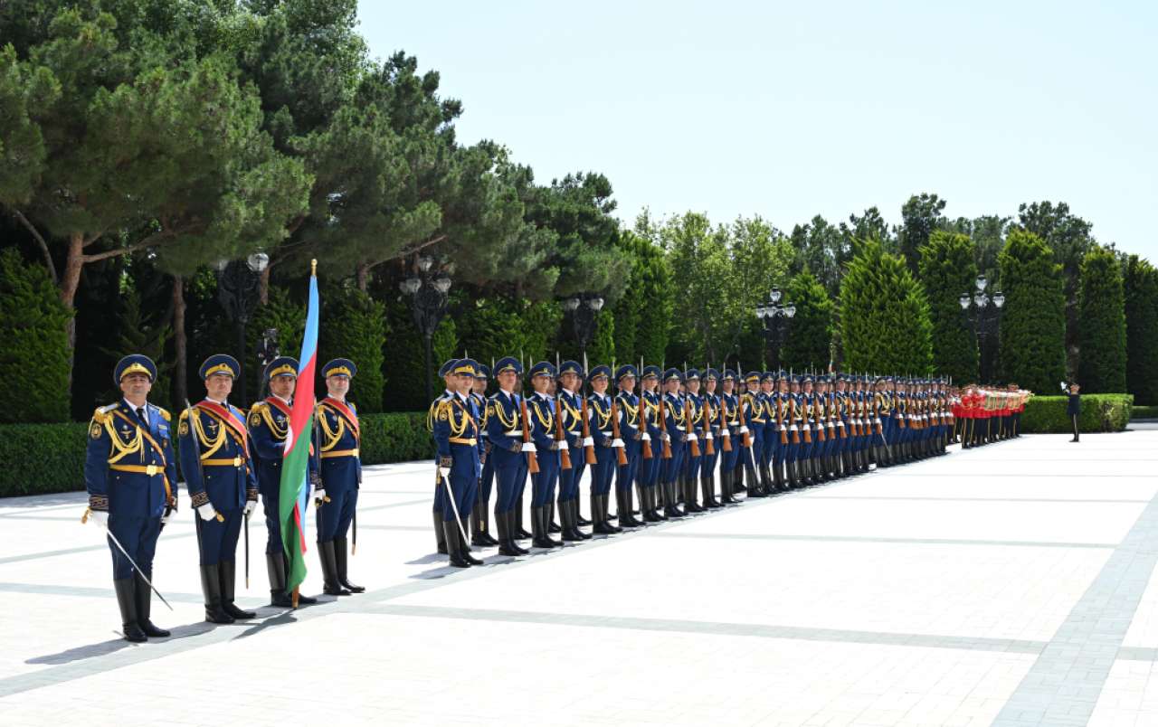 The guard of honor marched in front of President Ilham Aliyev and President Shavkat Mirziyoyev to the accompaniment of a military march.