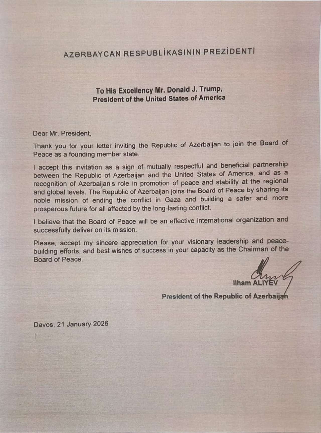 Məktubda daha sonra deyilir: “Bu dəvəti Azərbaycan Respublikası ilə Amerika Birləşmiş Ştatlarının qarşılıqlı hörmətə əsaslanan faydalı tərəfdaşlığının, həmçinin Azərbaycanın regional və qlobal miqyasda sülh və sabitliyin təşviqində rolunun tanınmasının rəmzi olaraq qəbul edirəm.