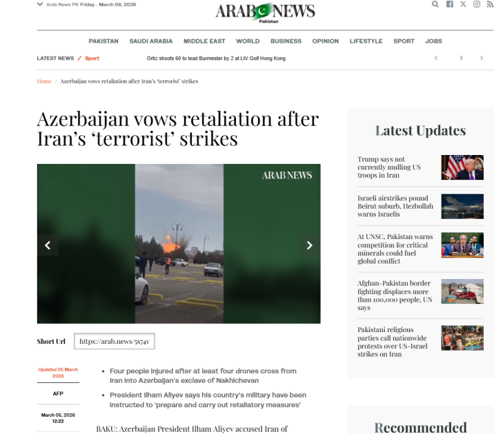 “Arab News” Azərbaycan Müdafiə Nazirliyinin İranın dron hücumu ilə bağlı məlumatını və Naxçıvanda yaralıların vəziyyəti haqqında informasiyanı da diqqətə çatdırıb.