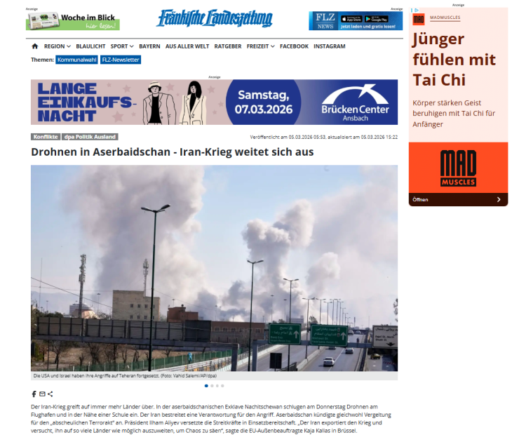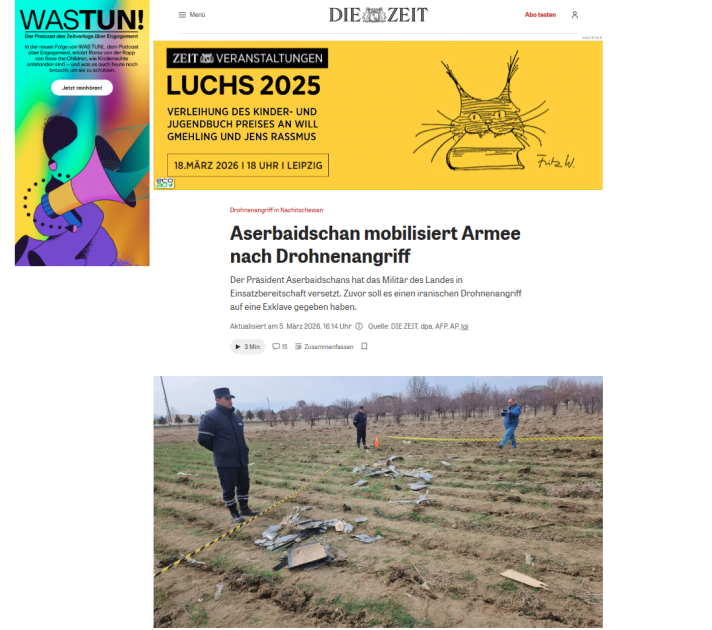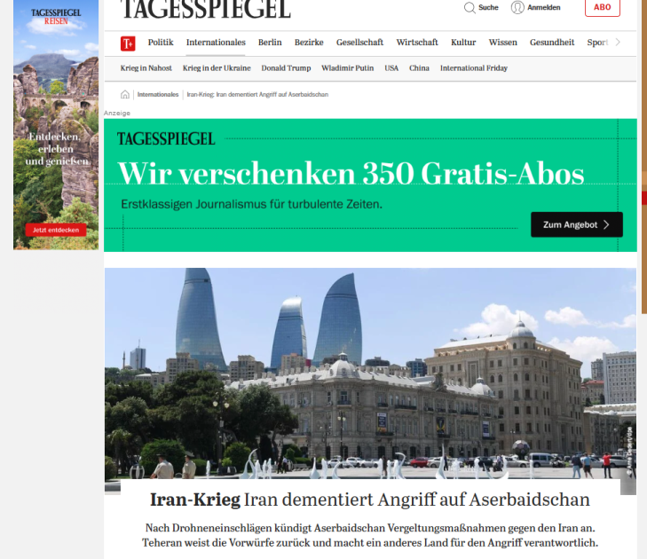 "Şərq qapısı" xəbər verir ki, Almaniya mediası dövlətimizin başçısının çıxışından əsas məqamları işıqlandırıb. “Morgenpost”, “Börsen News”, “FLZ. News”, Tagesspiegel”, “Frankfurter Rundschau”, “Wirthschau Woche”, “Die Zeit”, “Ad Hoc News”, Cash”, Sarganserlander”, “Ostfriezen Zeitung” qəzet və portallarının materiallarında Azərbaycanın Naxçıvan Muxtar Respublikasında aeroportun, məktəb binasının və digər mülki obyektlərin dron hücuma məruz qaldığı diqqətə çatdırılıb. Qeyd olunub ki, Prezident İlham Əliyevin sədrliyi ilə keçirilən Təhlükəsizlik Şurasının iclasında bu hücum sərt şəkildə pislənilib, həmçinin İran səfiri insidentlə bağlı Azərbaycan Xarici İşlər Nazirliyinə çağırılıb. Azərbaycan lideri İranın hücumunu “terror aktı” adlandırıb və onun göstərişi ilə Azərbaycan Silahlı Qüvvələri yüksək döyüş hazırlığına gətirilib.