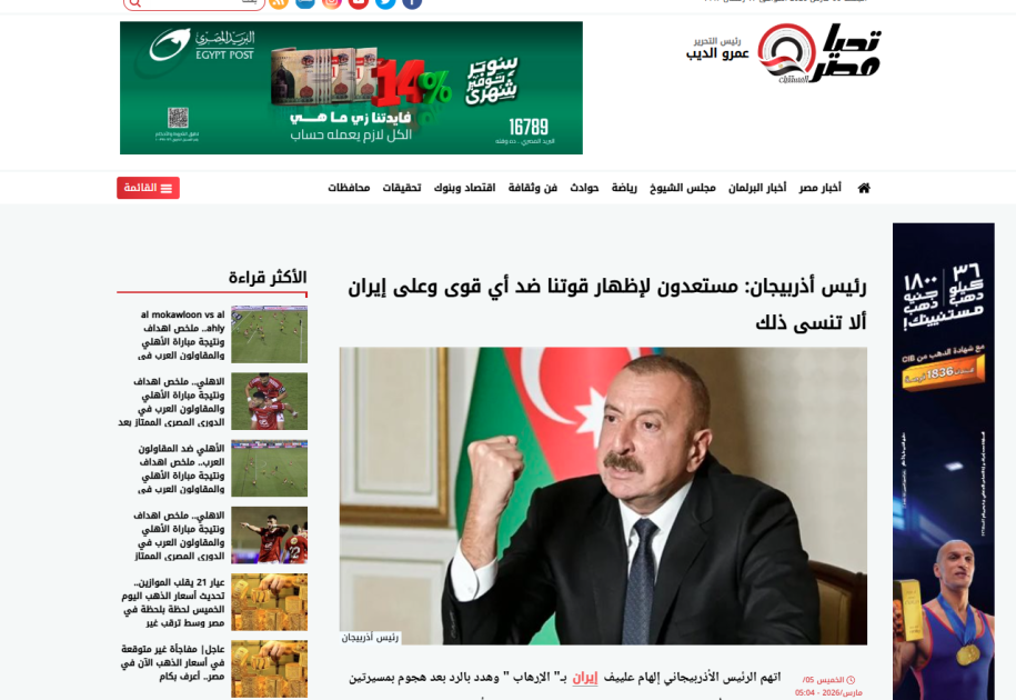 “Mc-Doualiya”, Tahia Masr” portallarının materiallarında qeyd olunub ki, Azərbaycan Prezidenti İlham Əliyev cümə axşamı İranı səbəbsiz terror və təcavüz aktı törətməkdə ittiham edib və orduya cavab tədbirləri hazırlamaq və həyata keçirmək barədə göstəriş verib. Yazılarda Azərbaycan Müdafiə Nazirliyinin məlumatı və İran səfirinin XİN-ə çağırılması da diqqətə çatdırılıb.