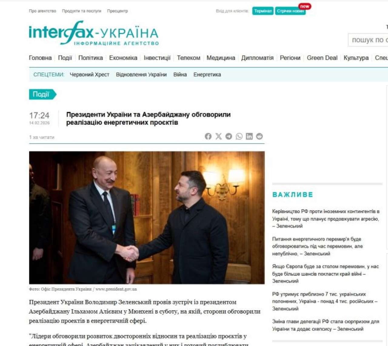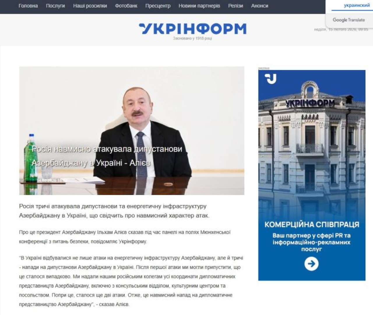 Ukraynanın aparıcı media orqanlarında Azərbaycan Prezidenti İlham Əliyevin Münxen Təhlükəsizlik Konfransında iştirakına, keçirdiyi görüşlərə və səsləndirdiyi fikirlərə geniş yer ayrılıb.